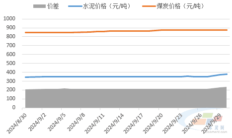 图3:2024年9月水泥价格、煤炭成本及价格差(元/吨)