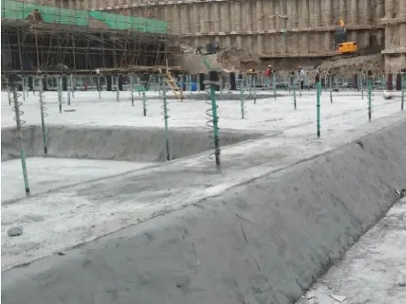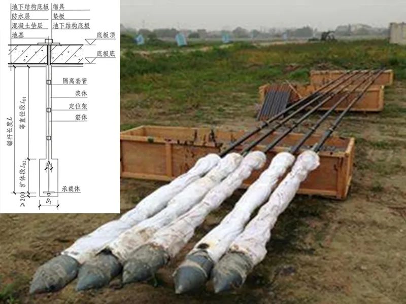 扩大头抗浮锚杆,是采用高压喷射等手段在锚杆底端形成一个扩大头,注浆后端部结构更稳固,有效提高锚杆抗拔力,以囊式注浆扩大头抗浮锚杆为例,相较于传统抗浮锚杆:承载力高、变形小、抗腐蚀耐久性好,有效解决工程抗浮安全隐患;施工简便、经济实用、环保可持续。