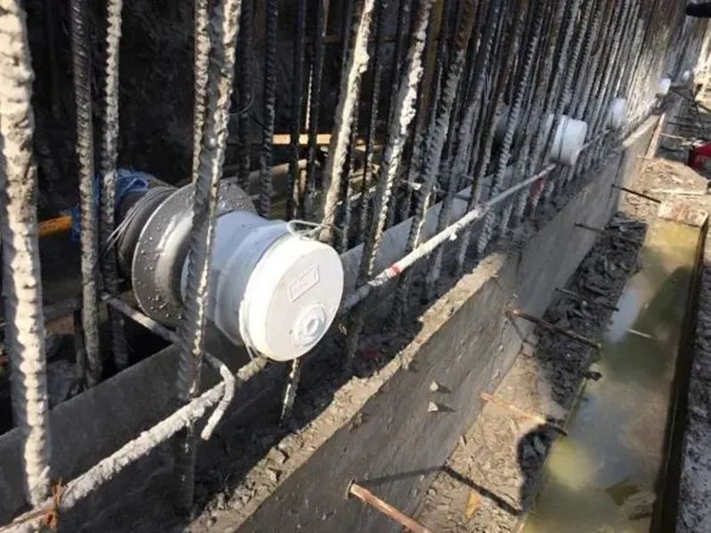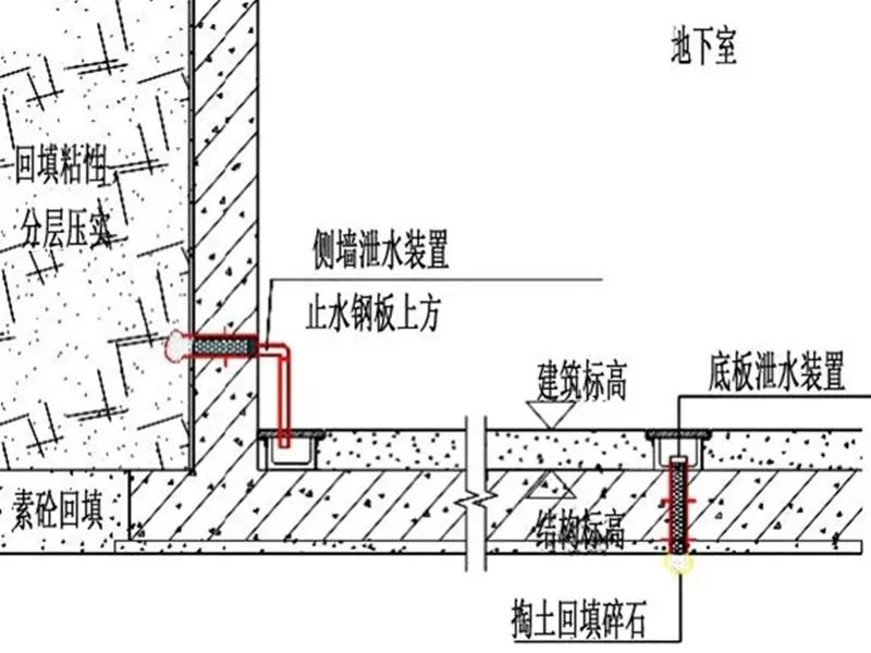 泄水减压装置,是地下室抗浮新技术,通过在地下室侧墙及底板上间隔埋设泄水装置,将室外地下水引至室内排水系统排出,从而降低地下水对地下室的浮力作用,与常规抗浮方法相比:工艺简单,充分利用了地下室现有排水系统,降低成本;可与主体结构同步施工,不占工期,节省施工时间。