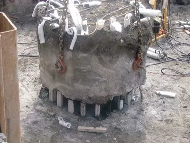 蜂窝式桩头破除技术,钢筋笼下放前,将桩头深入承台内的钢筋套上隔离套管,像蜂窝煤一样,使桩头钢筋与灌注混凝土之间没有粘结,破桩时采用吊机垂直吊起移除桩头,对桩头顶面进行人工修正后,即进入下道工序,相较于传统桩头破除施工:质量可靠,安全高效,实现桩头钢筋无损快速破除。