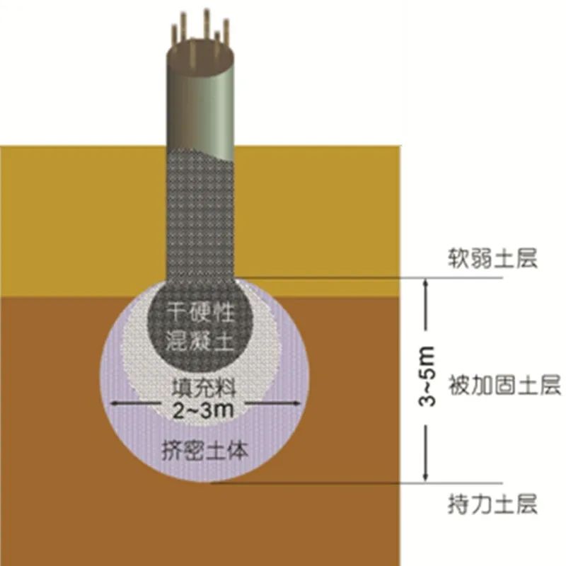 载体桩复合地基,是由混凝土、夯实填充料、挤密土体三部分构成复合地基扩展基础,将作用在桩顶上部的竖向荷载,通过桩身传到复合载体,并扩散到基础底部的持力层,相较于传统CFG桩复合地基:单桩承载力更高,优化桩长及数量,节约工期,降低成本,绿色施工效果更好。