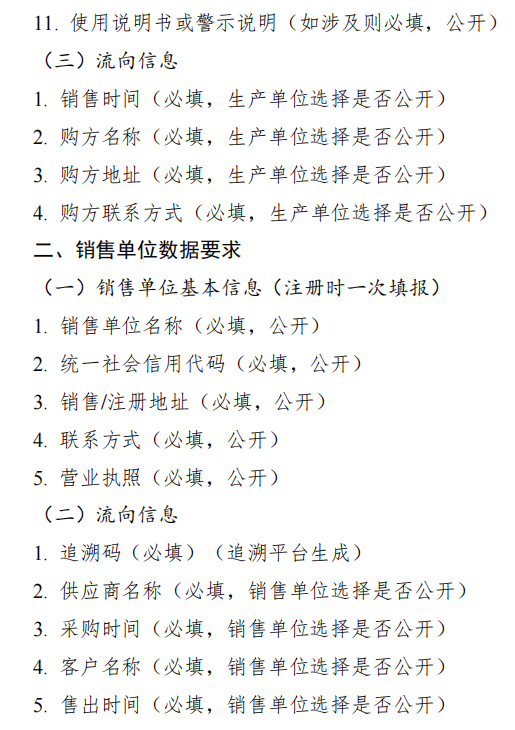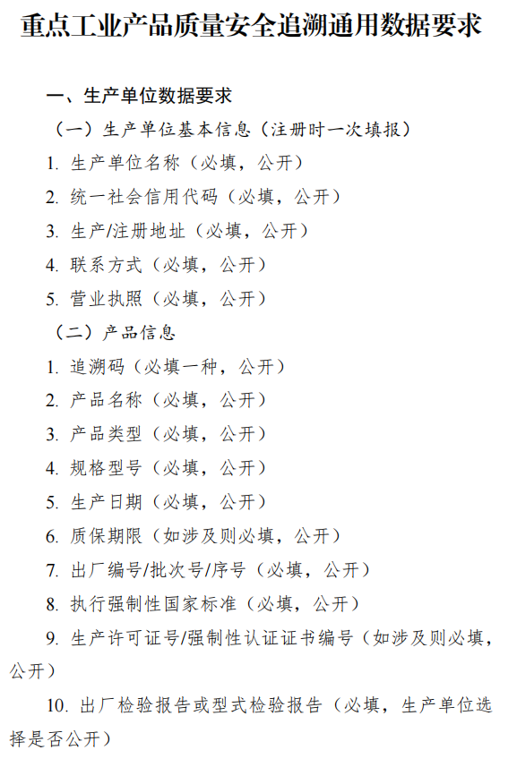(五)生产销售单位追溯要求。生产单位应如实填报生产单位基本信息、产品信息、流向信息等产品质量安全关键信息。销售单位通过扫码查询等方式查验重点工业产品信息,并按追溯通用数据要求将重点工业产品进货和销售信息归集至追溯平台。