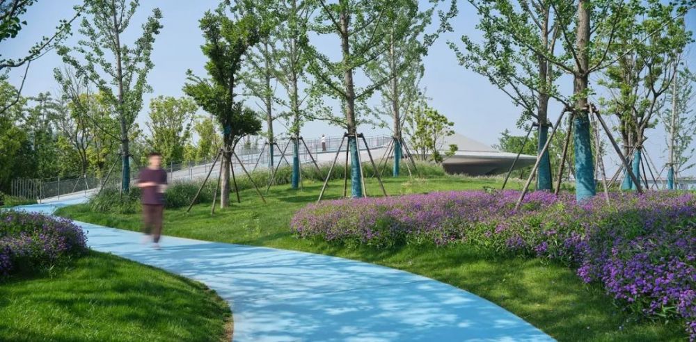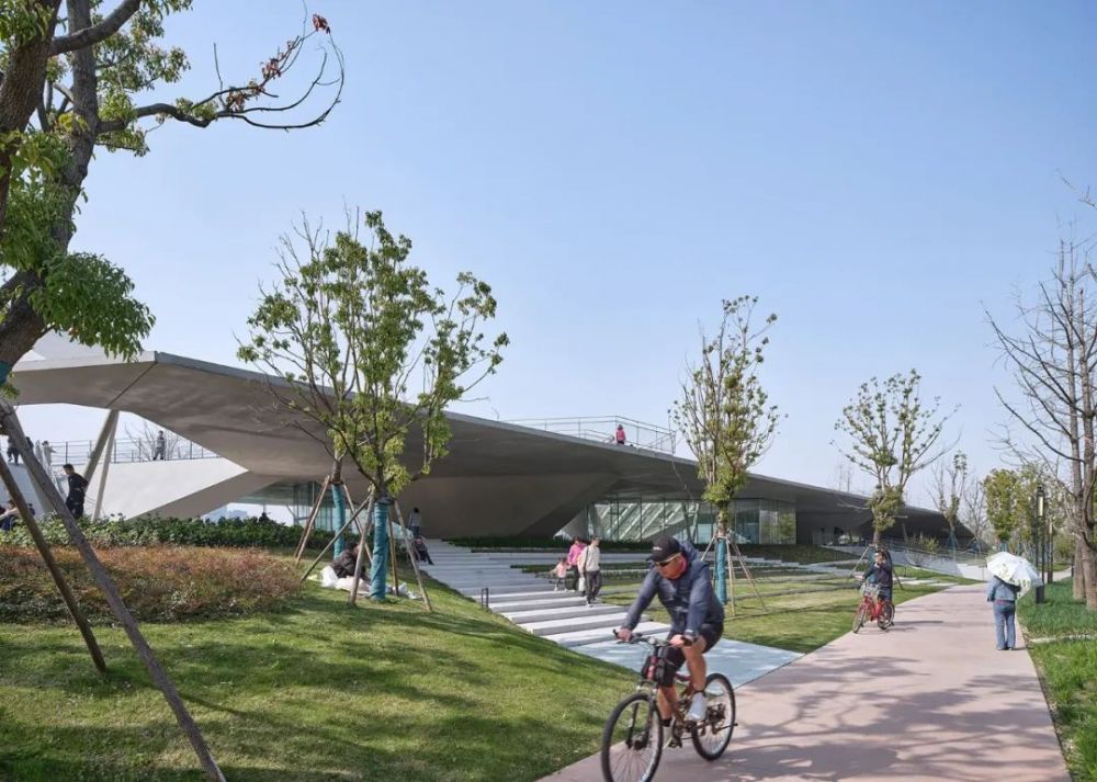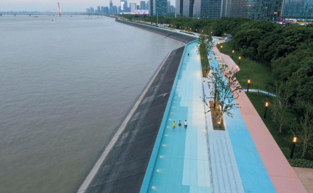 © 同济原作设计工作室在云渡驿站,跑道被抬高至建筑之上,不仅成为建筑外观的一部分,还为江景体验提供了丰富的视角。这一设计使得城市景观立体化,从不同层次展现出多维度的视觉效果。响应浙江省水利厅关于海塘安澜千亿工程号召,将安澜提标内容融入沿江景观改造。在保持沿江一线护栏高度不变的基础上,结合消浪平台,将海塘高度提升至10.3米,完成海塘提标约4.5公里,将该段环杭州湾海塘防御标准从100年一遇提升到300年一遇。