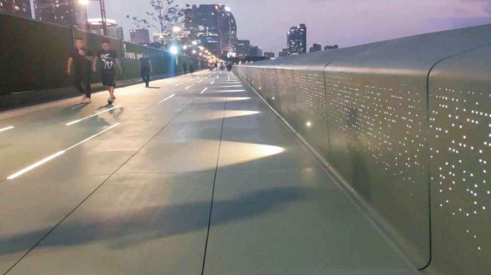 @陕西巨匠文化建材科技有限公司在不增加海塘高度的情况下,通过艺术化处理大面积悬挑的混凝土平台实现了防洪功能的提升。而其中的消浪平台的拦挡使用了预制蓝色透光混凝土护栏板,通过特殊的材质与透光效果,增强了护栏板与路面的整体感,同时提升了夜间的美观性,成为滨江沿线的标志性景观。这些设计细节,使得混凝土从传统建筑材料转变为艺术表达的载体。