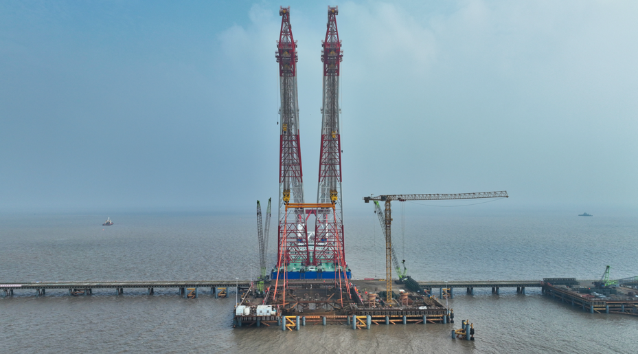 此次吊装作业的钢吊箱位于杭州湾跨海铁路大桥160号主墩,内外水头差达25米,为国内最大高度。在钢吊箱下放过程中,项目团队采用全自动化智能监控平台,动态监测、预警钢吊箱应力、姿态、高程等情况,并以三维界面进行实时场景还原,全方位展示钢吊箱姿态和受力状态,确保了整个下放过程的“万无一失”。