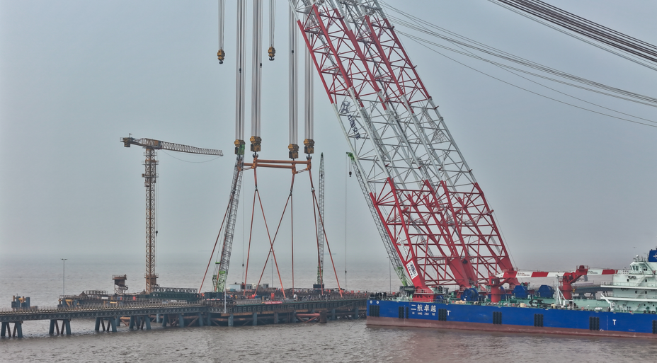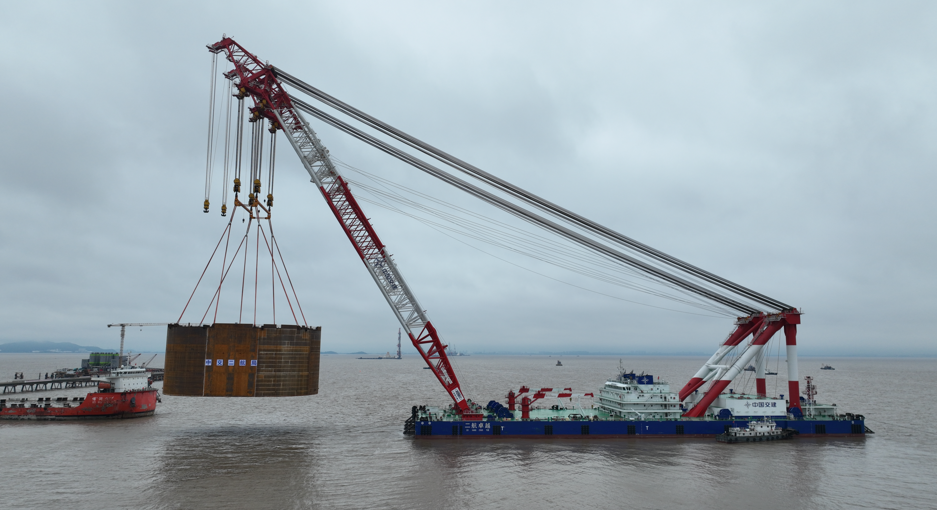 10月28日10时50分,在世界三大强潮海湾之一的杭州湾海平面上,高25.1米、长55.7米、宽40.2米、重达2500吨的杭州湾跨海铁路大桥160号主墩钢吊箱被“二航卓越”起重船稳稳沉放到设计位置,“二航卓越”顺利完成“首秀”。