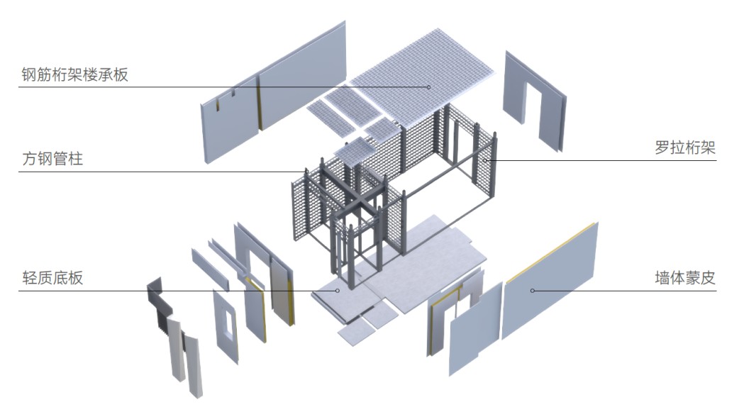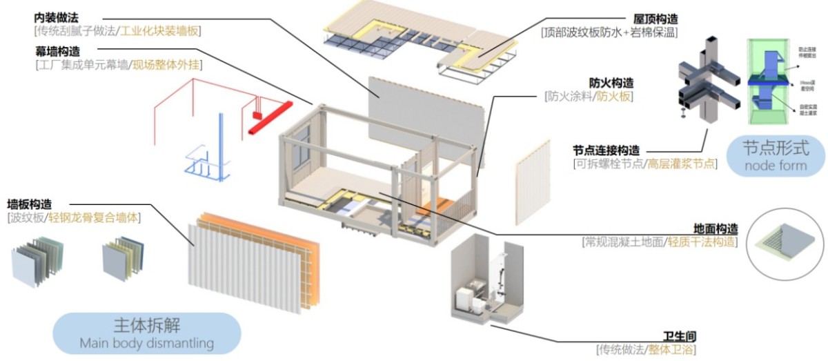针对大开间和大层高等不适合模块化实施的建筑空间,采用巨型框架—核心筒结构,针对宿舍等大量重复的建筑空间,采用模块化建筑,通过现场施工和工厂预制的同步施工,大幅降低总施工时间,提高建造效率。
