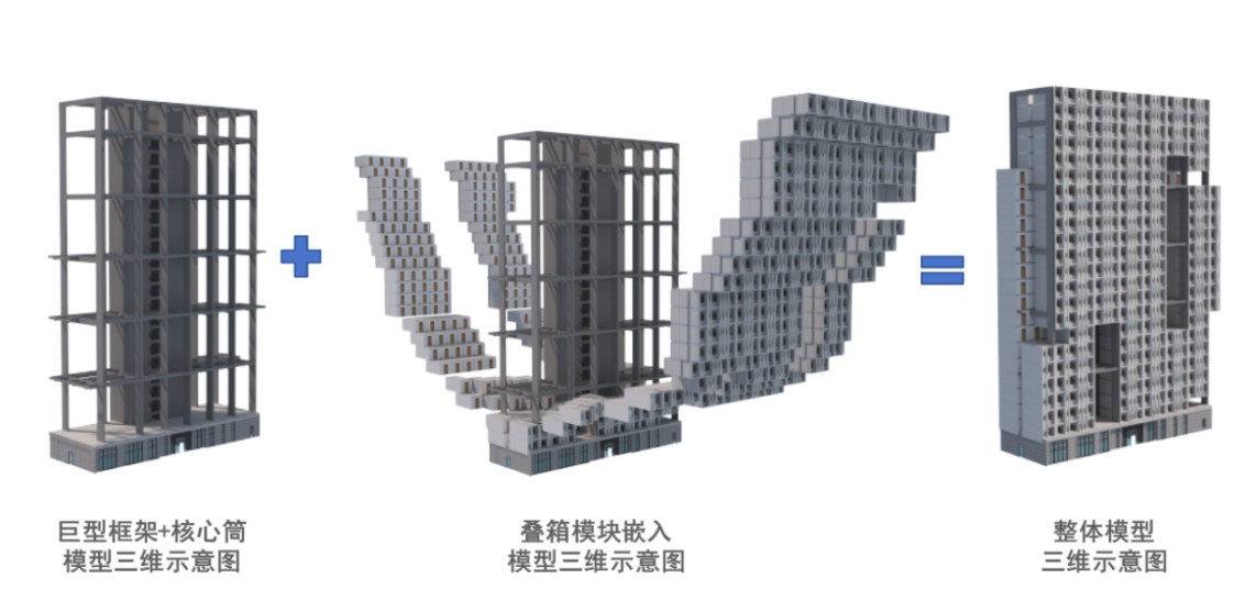 由特区建工研发。该模块化技术采用内嵌式设计理念,主次结构的承载方式,主结构采用钢结构框架-支撑结构,每多层设置一道结构梁,主结构将模块传来的竖向荷载传递至基础,同时可抵抗风荷载和地震作用,保证建筑的侧向稳定。模块作为次结构,只承担自身及其上部叠箱的自重,通过连接件与主结构形成一个整体。在这种体系下,模块对主结构具有减震(振)阻尼器的效应,会使整个结构体系更加安全可靠经济。